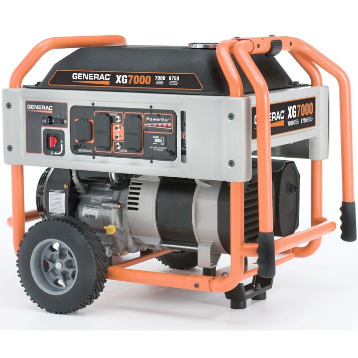 larger image). For unexpected blackouts, this is enough wattage to run home appliances such as security systems, computers, and electric stoves, as well as window A/C units and sump pumps. For construction and landscaping applications, it's enough to support large devices such as lawn mowers, belt sanders, and table saws. And for camping and outdoor events, it can run portable stereos, outdoor lights, and electric grills. (Note: All appliances should be checked for actual wattage ratings.) This generator's sturdy, 9-gallon steel tank ensures a full 12 hours of operation at a 50-percent load, letting you relax for hours of use. You can monitor fuel levels at a glance with the tank's built-in fuel gauge, while the unique lighted Power Bar displays available wattage. Its 120-volt outlets are circuit-breaker protected, guarding against power overloads and allowing the generator to smoothly send power to your appliances. This generator is backed by a two-year limited residential warranty (one-year warranty for commercial applications). What's in the Box Generac XG7000-5797 XG Series 7,000-watt 410cc OHVI portable gas-powered generator (Non-CARB Compliant), wheel kit, handles, first oil supply, and manual. .matrix { font-family: Verdana, Helvetica neue, Arial, serif; font-size: 10px; } .matrix_header { font-family: Verdana, Helvetica neue, Arial, serif; font-size: 12px; font-weight: bold; } .matrix_plain { font-family: Verdana, Helvetica neue, Arial, serif; font-size: 12px; } .matrix_plainsmall { font-family: Verdana, Helvetica neue, Arial, serif; font-size: 10px; } .matrix_title { font-family: Verdana, Helvetica neue, Arial, serif; font-size: 18px; font-weight: bold; } ul.matrix { list-style: inside disc; text-indent: -12px; font-size: 12px; line-height: 1.5em; }